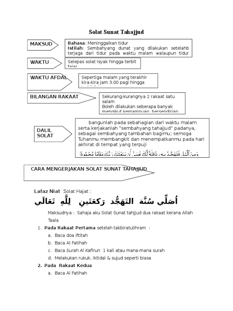Mengucapkan niat sholat Tahajud pelan dan menghayati artinya dalam hati. Sepertimana solat sunat yang lain solat tahajjud juga sama dari segi rukun syarat sah dan lain-lainnya seperti solat fardhu. Khớp với kết quả tìm kiếm.